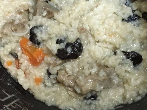 為何要先關掉呢,如果用電子鍋煮滿1小時的話,會變成燉飯喔 所以在煮25分鐘後就可以關掉,濃稠度大約如下(我家喜愛這稠度),一打開後在鍋中還未盛起來就拍了 q